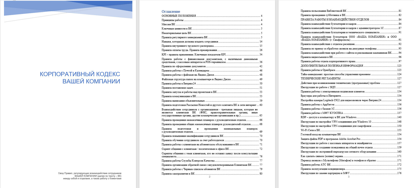 Безусловно, представим вам черновой вариант корпоративного кодекса, чтобы уточнить все нюансы.